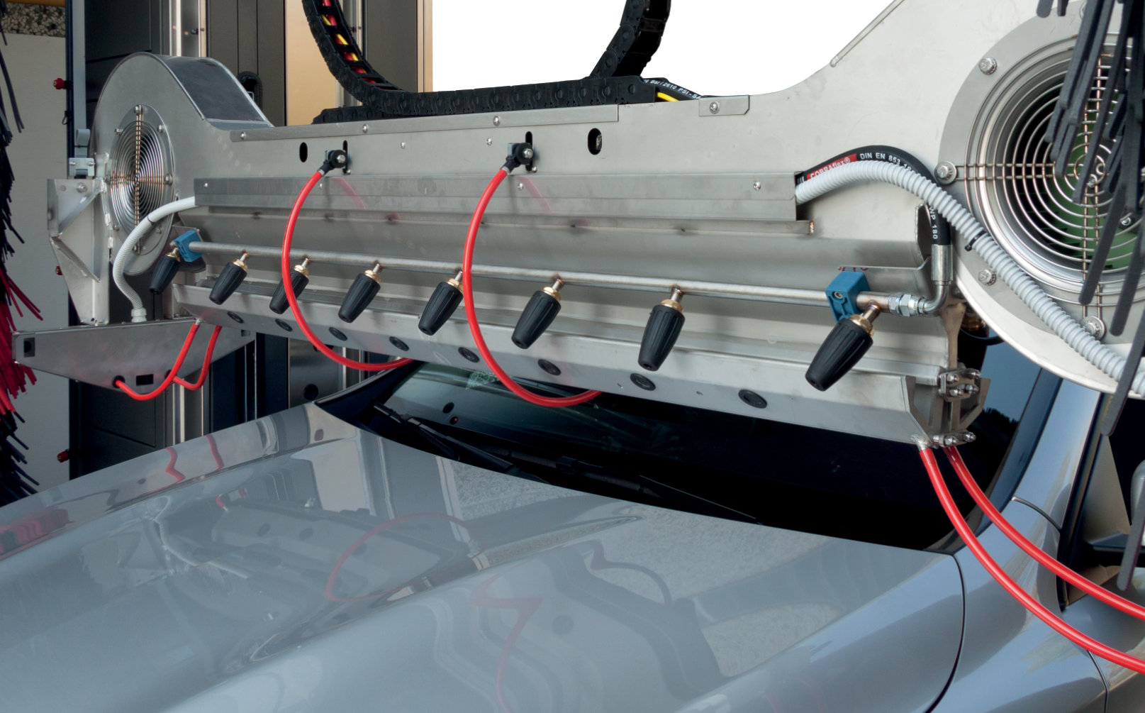 - O putere de curăţare sporită: echipamentul dispune de un număr de cinci pompe de presiune, din care trei deservesc cele trei duze cu translaţie (două pe verticală şi una pe orizontal) şi alte două pompe se ocupă de partea inferioară a maşinii (praguri, pasaje roţi, roţi) prin intermediul a 2 duze rotative.